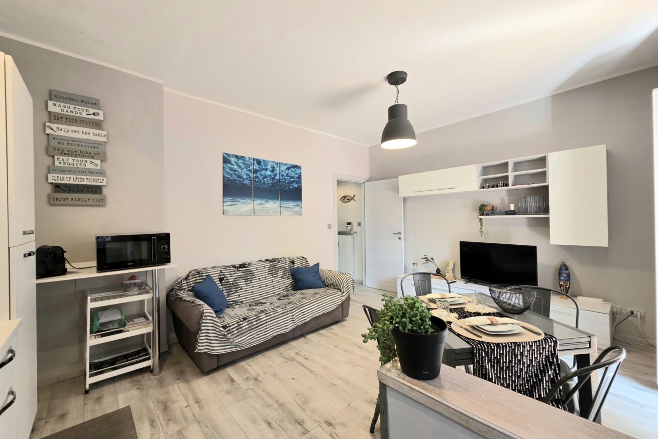 Accogliente e funzionale, con divano letto, mobile con TV, angolo cottura e accesso diretto al balcone.