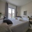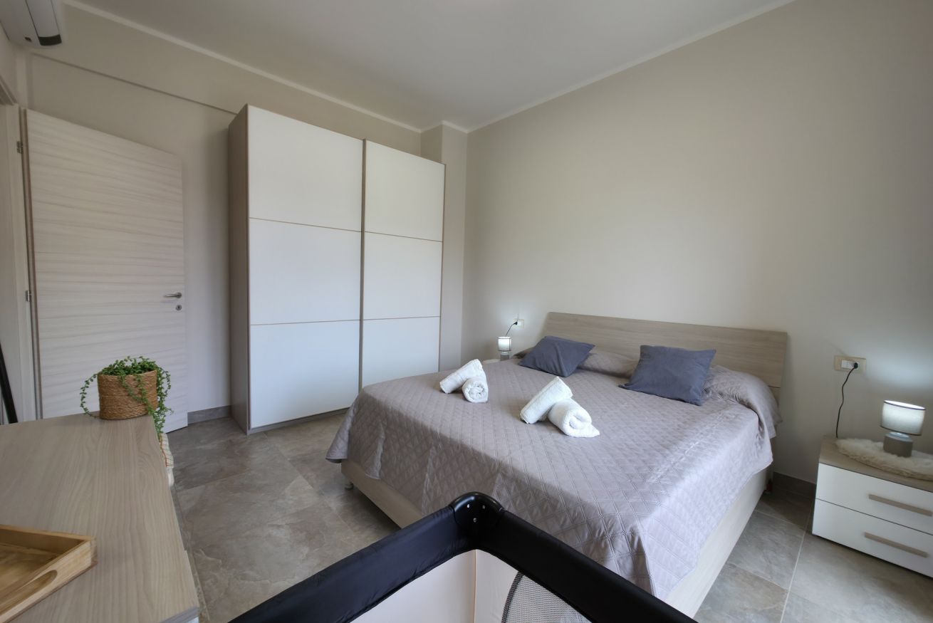 Letto matrimoniale, armadio, comodini con abat-jour, climatizzatore e accesso al balcone.