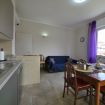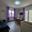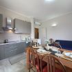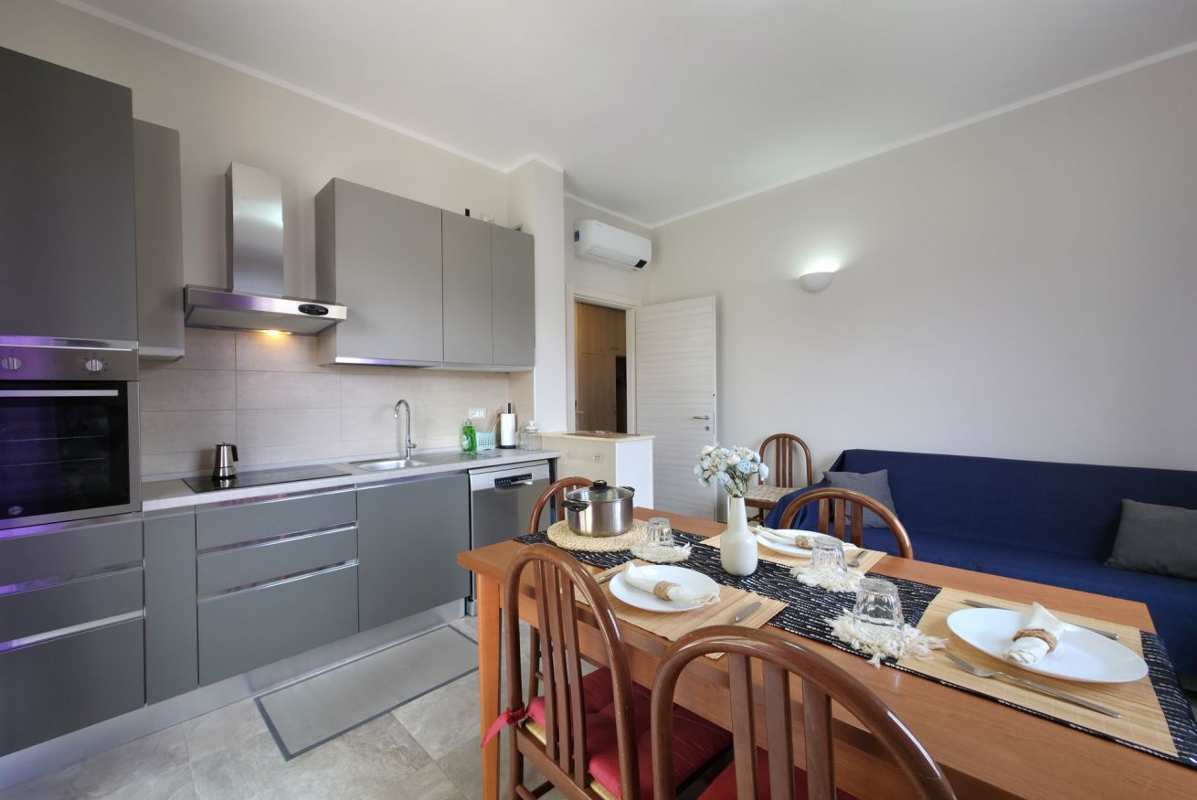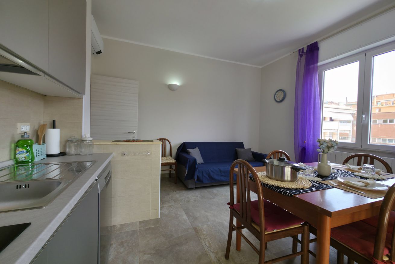 Zona giorno con angolo cottura, tavolo da pranzo con sedie, divano letto, climatizzatore e accesso al balcone.