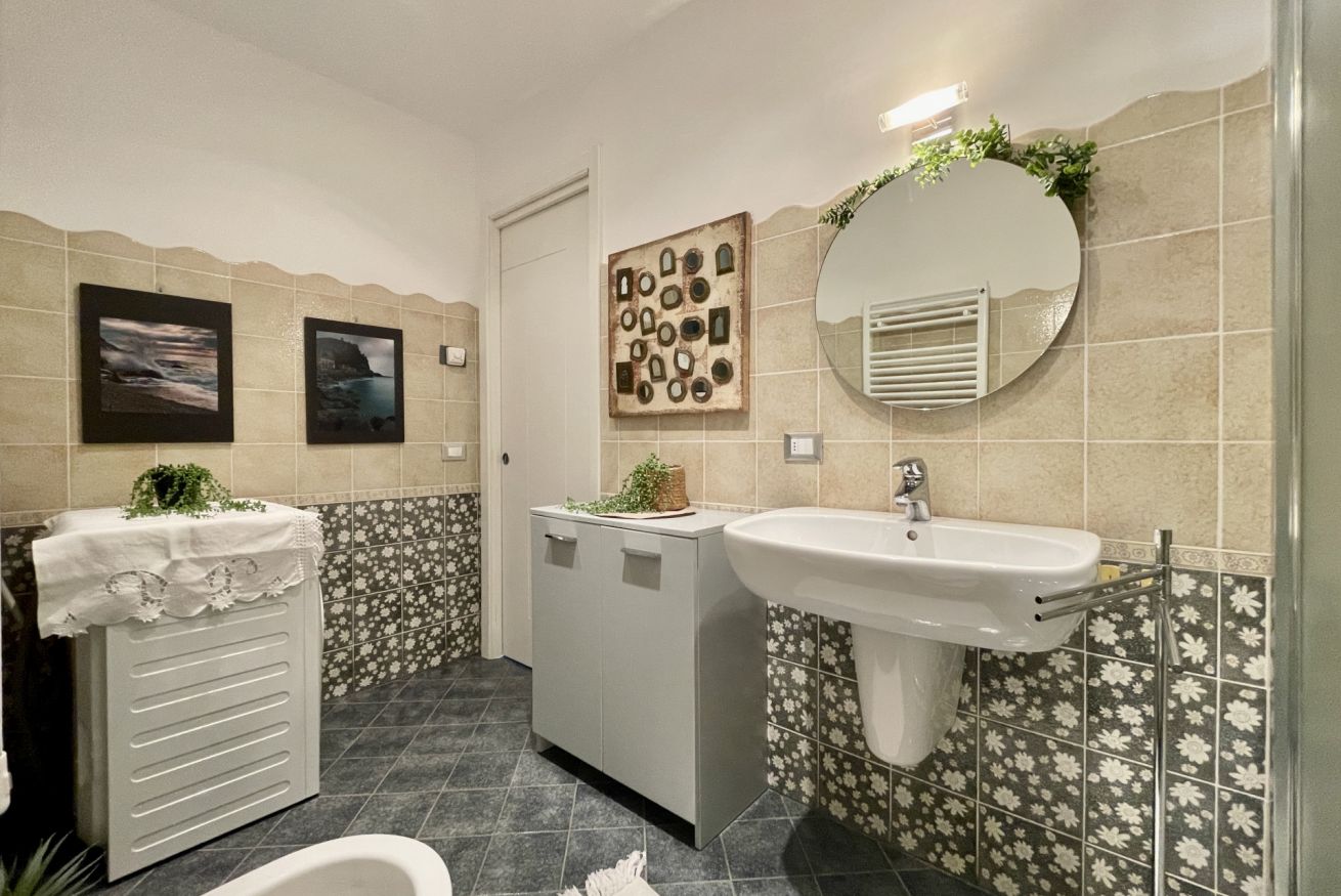 Completo di box doccia, lavatrice, sanitari, asciugacapelli e bagno doccia.