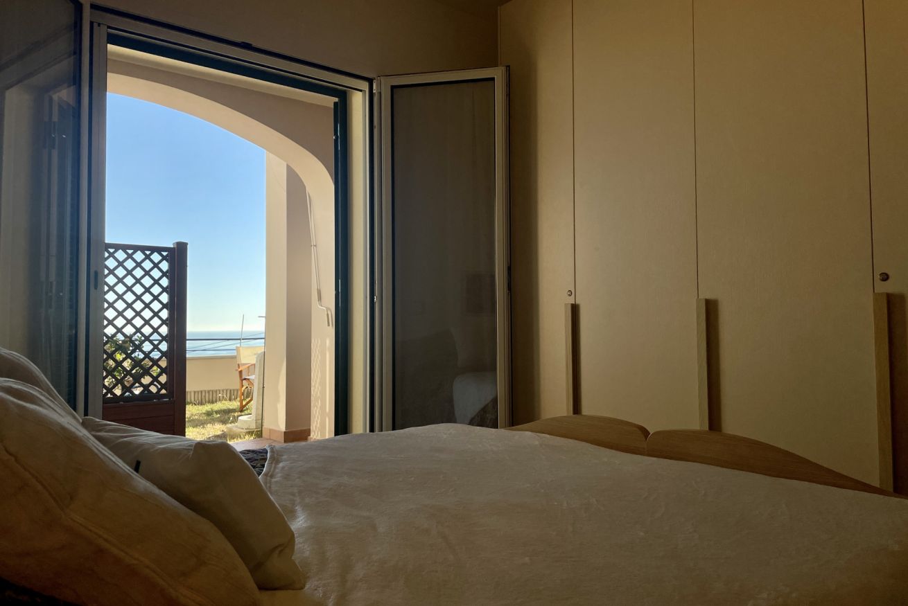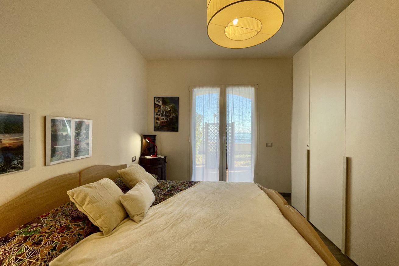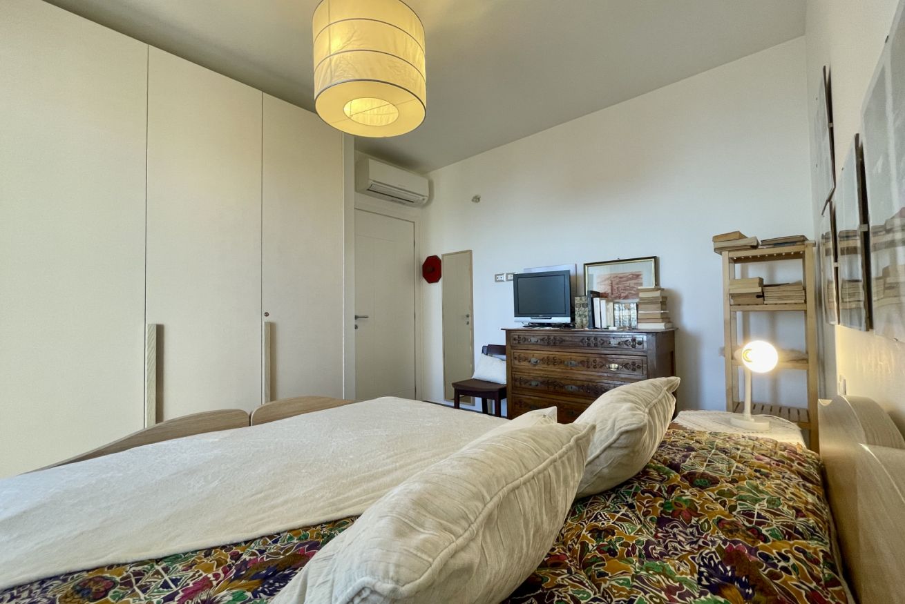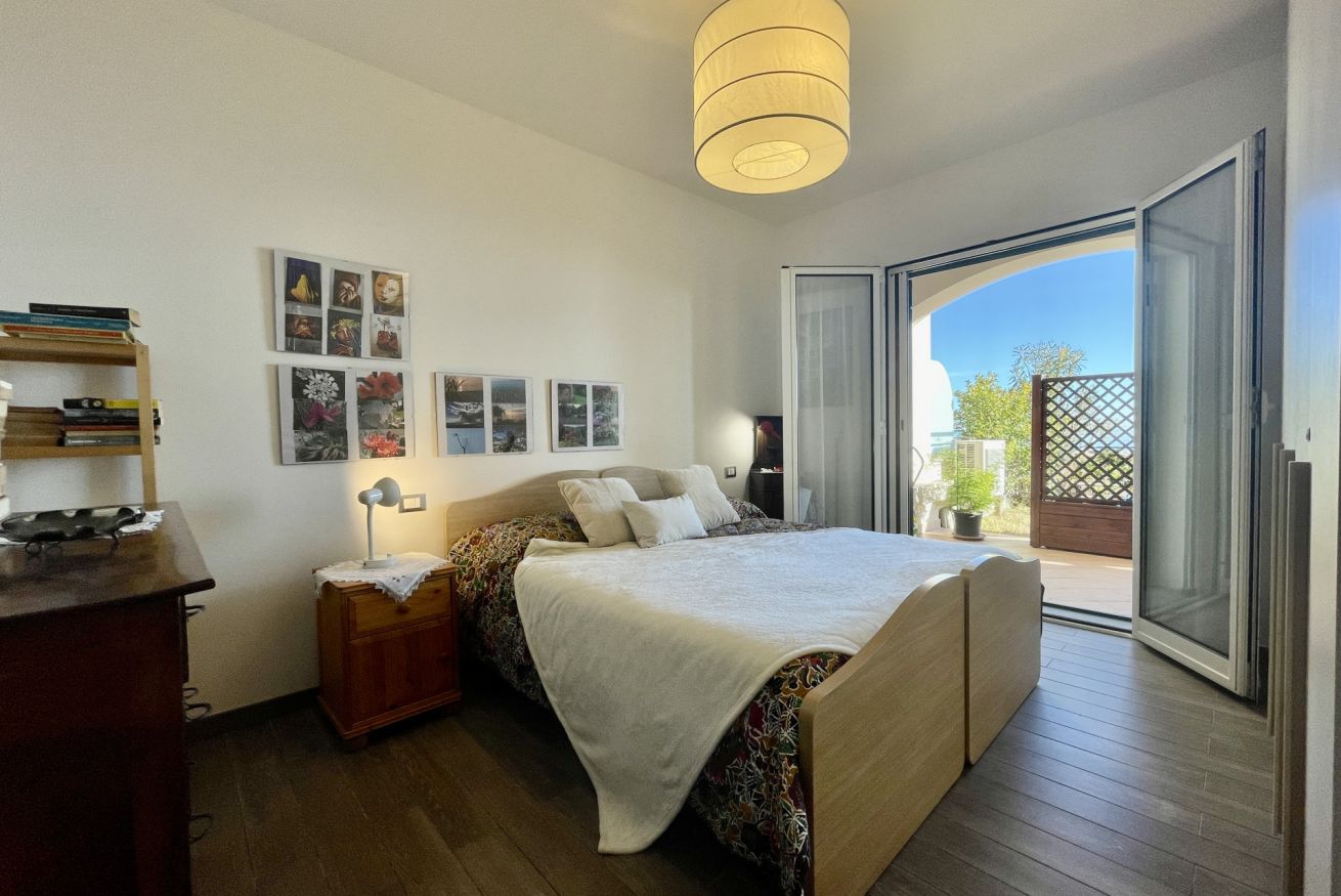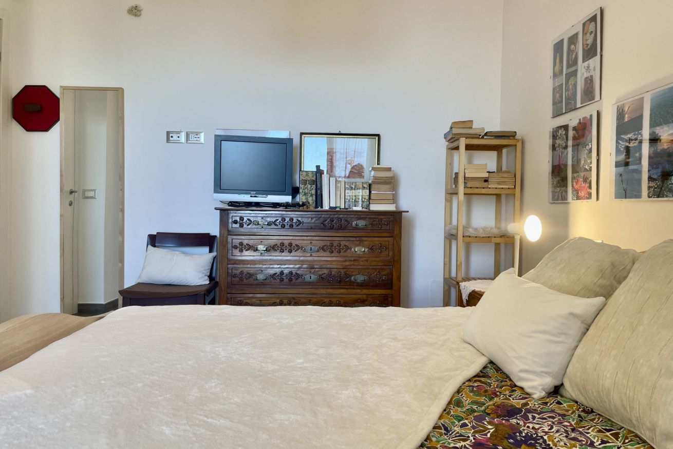 • Camera 1: letto matrimoniale (160×190), 2 comodini con abat-jour, armadio, cassettiera, mobile con libri in italiano e accesso diretto al terrazzo.