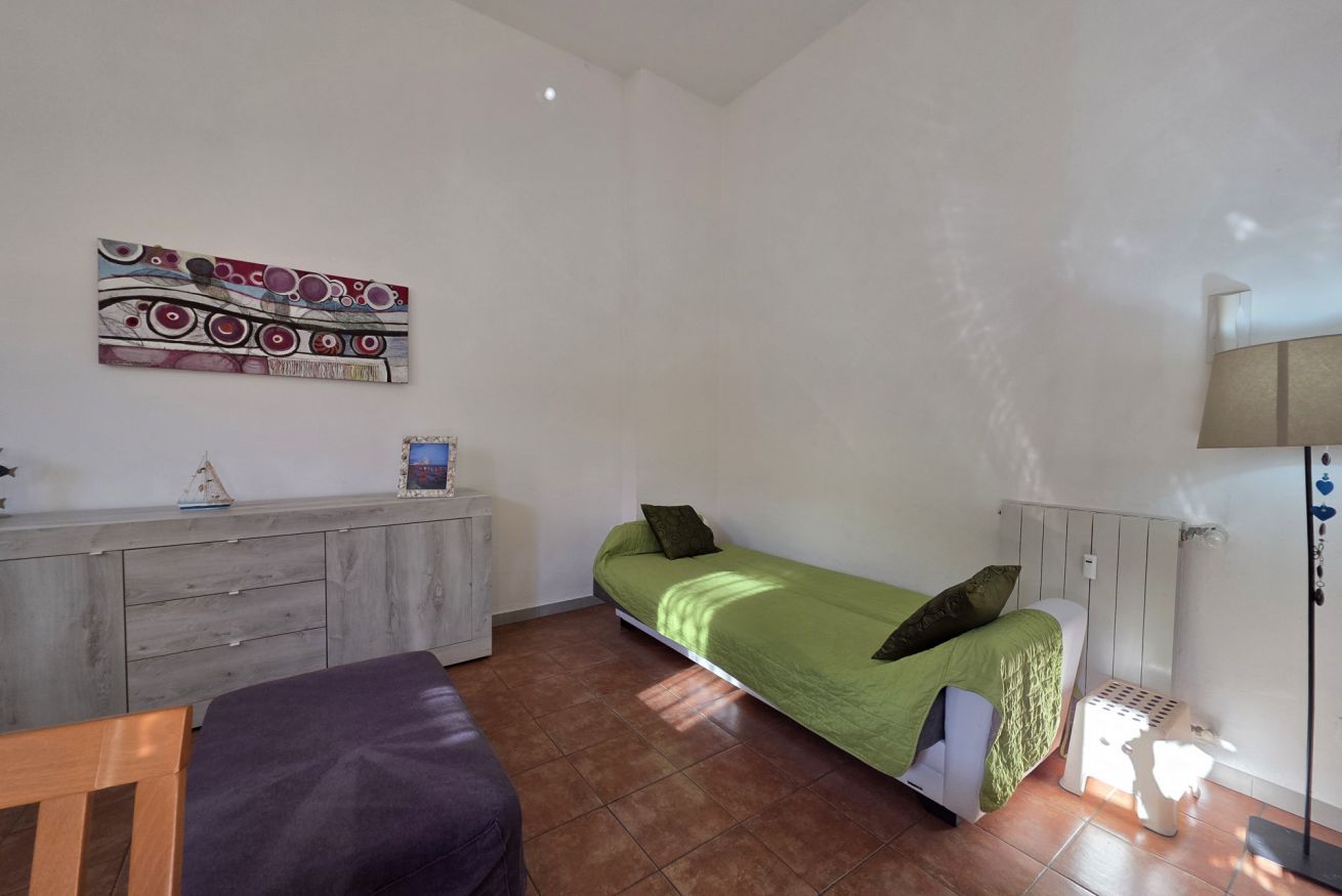 Divano letto, letto singolo, mobile con TV, climatizzatore e accesso diretto al giardino.