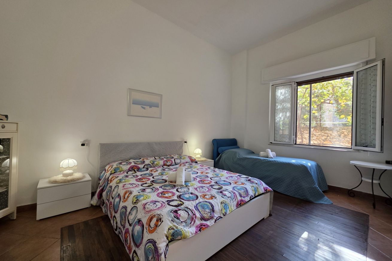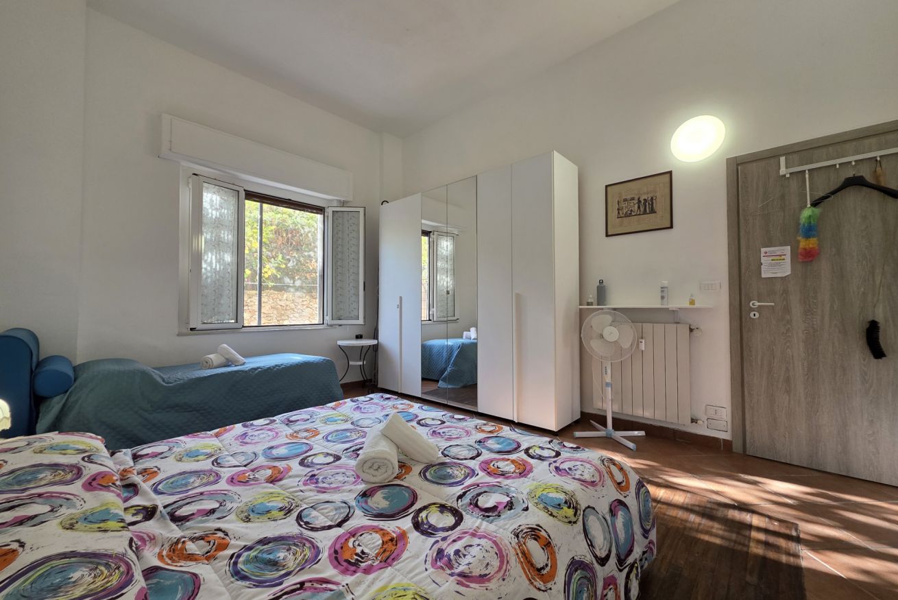 Letto matrimoniale, letto singolo, ventilatore a piantana, armadio e finestra con affaccio sul giardino.