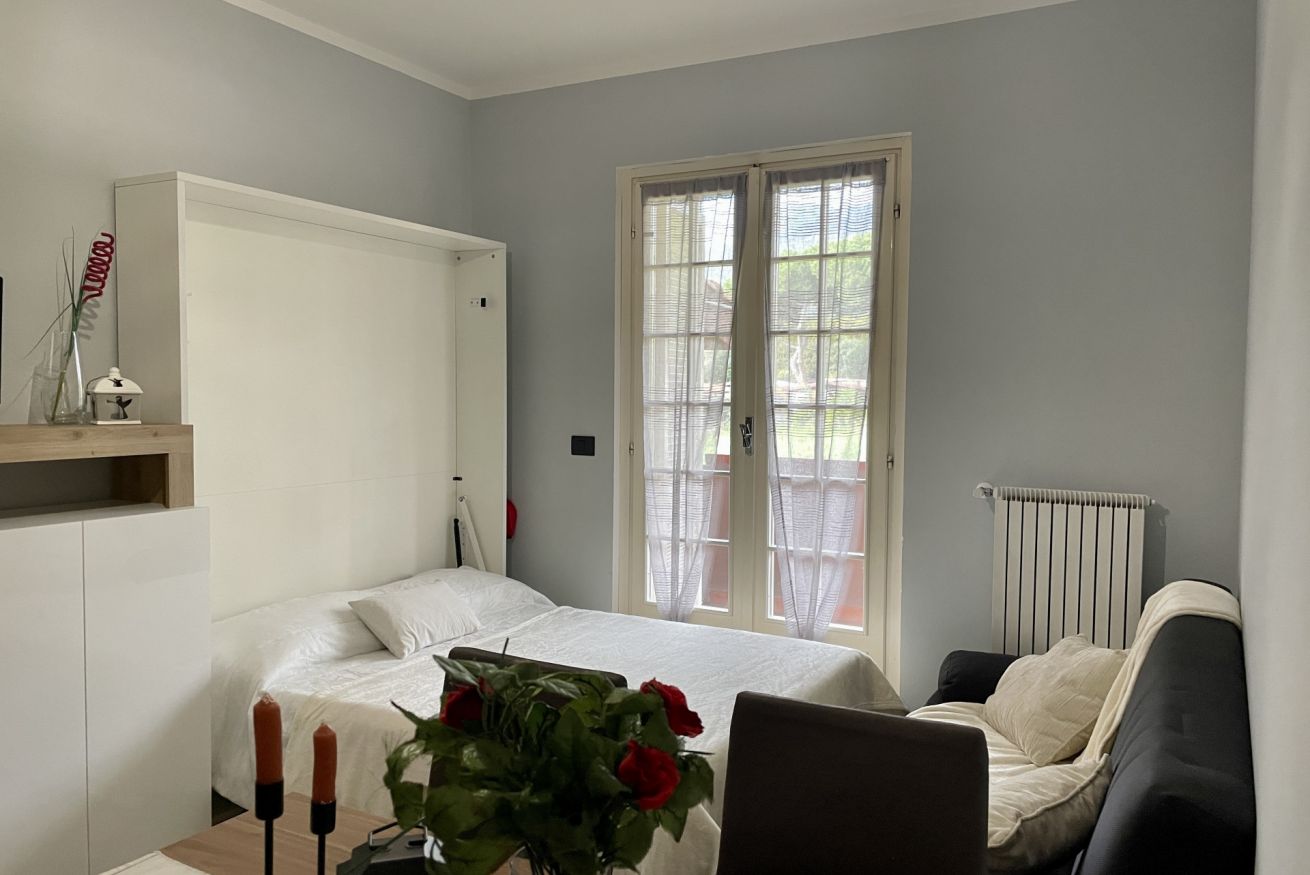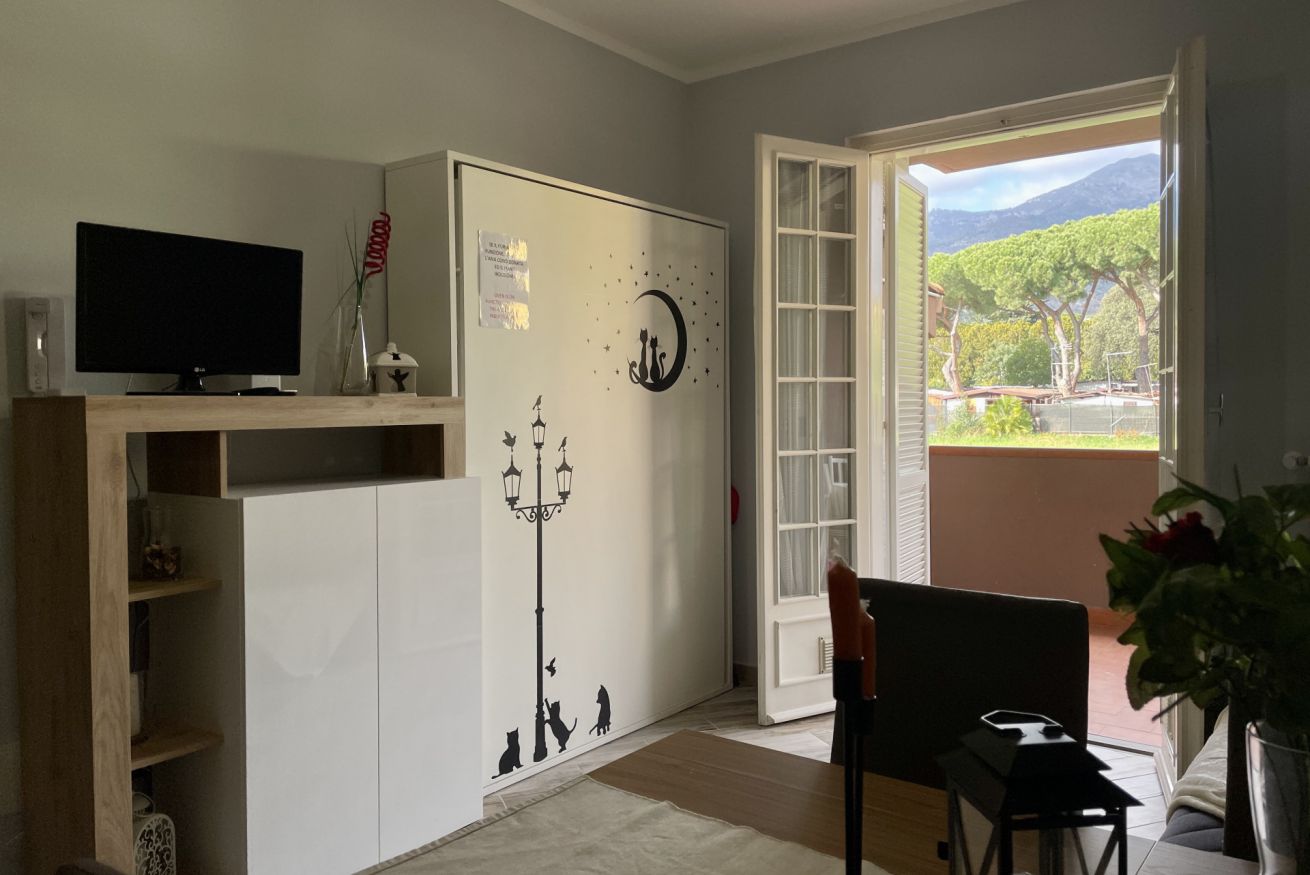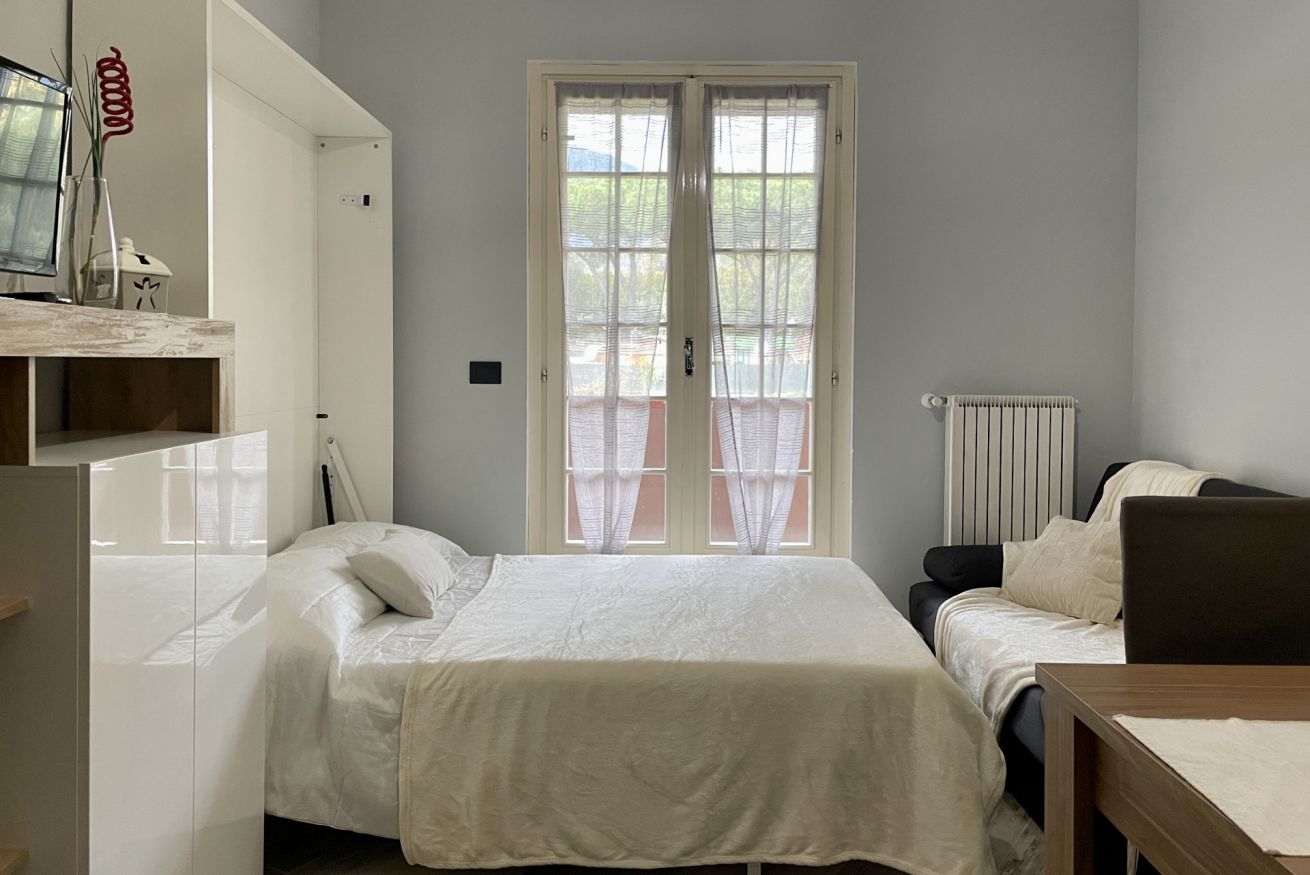 Tavolo da pranzo con 4 sedie, divano, Tv, letto matrimoniale a scomparsa e accesso al balcone.