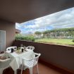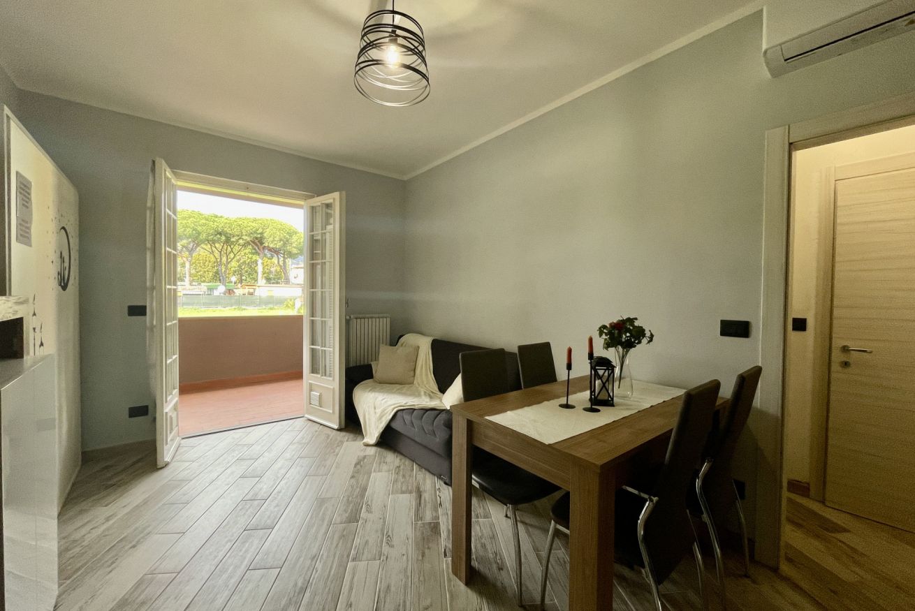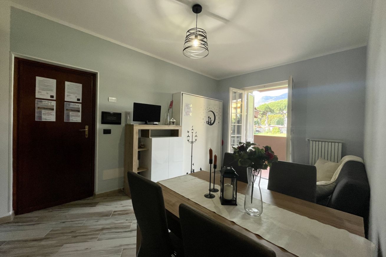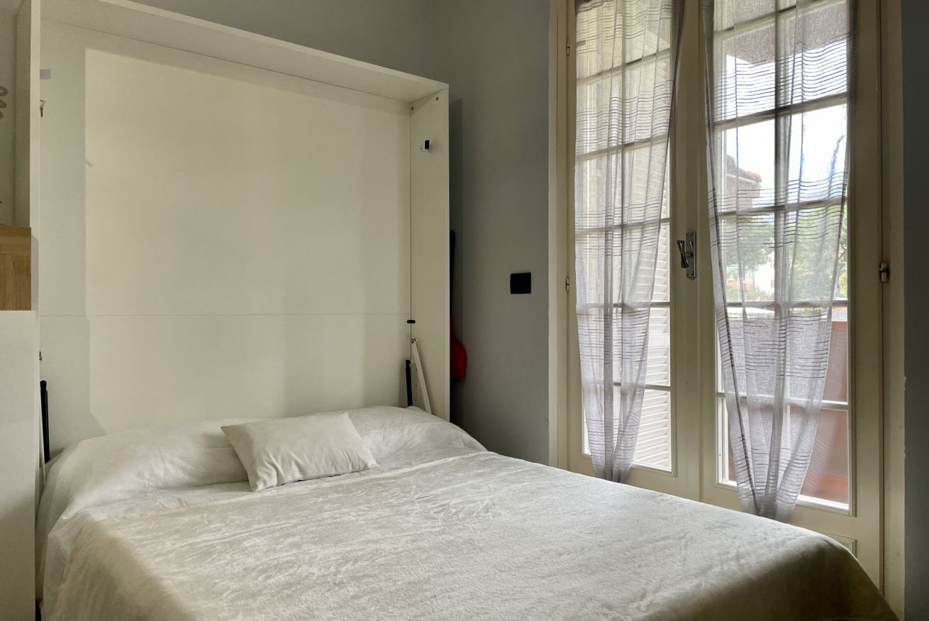 Tavolo da pranzo con 4 sedie, divano, Tv, letto matrimoniale a scomparsa e accesso al balcone.