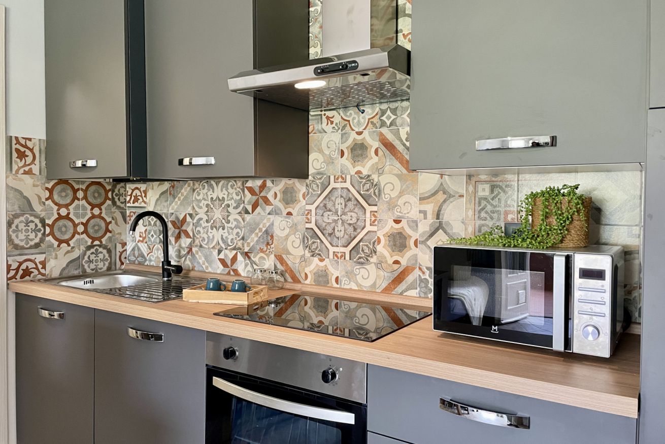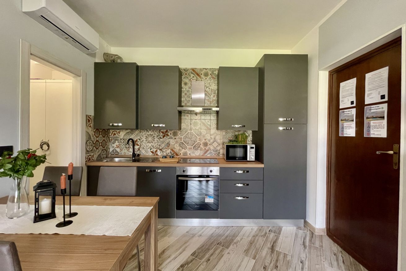 Provvisto di piano cottura a induzione con 4 fuochi, forno elettrico, microonde, frigorifero con congelatore, moka, set di pentole, posate, tazze, bicchieri, calici e utensili vari.