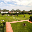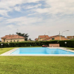 Piscina condominiale aperta in estate con sdraio e ombrellone.