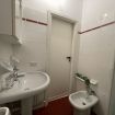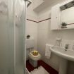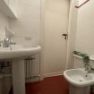 Bagno moderno con box doccia, lavatrice, sanitari completi, bagnodoccia e asciugacapelli.