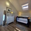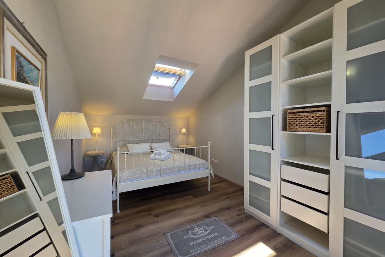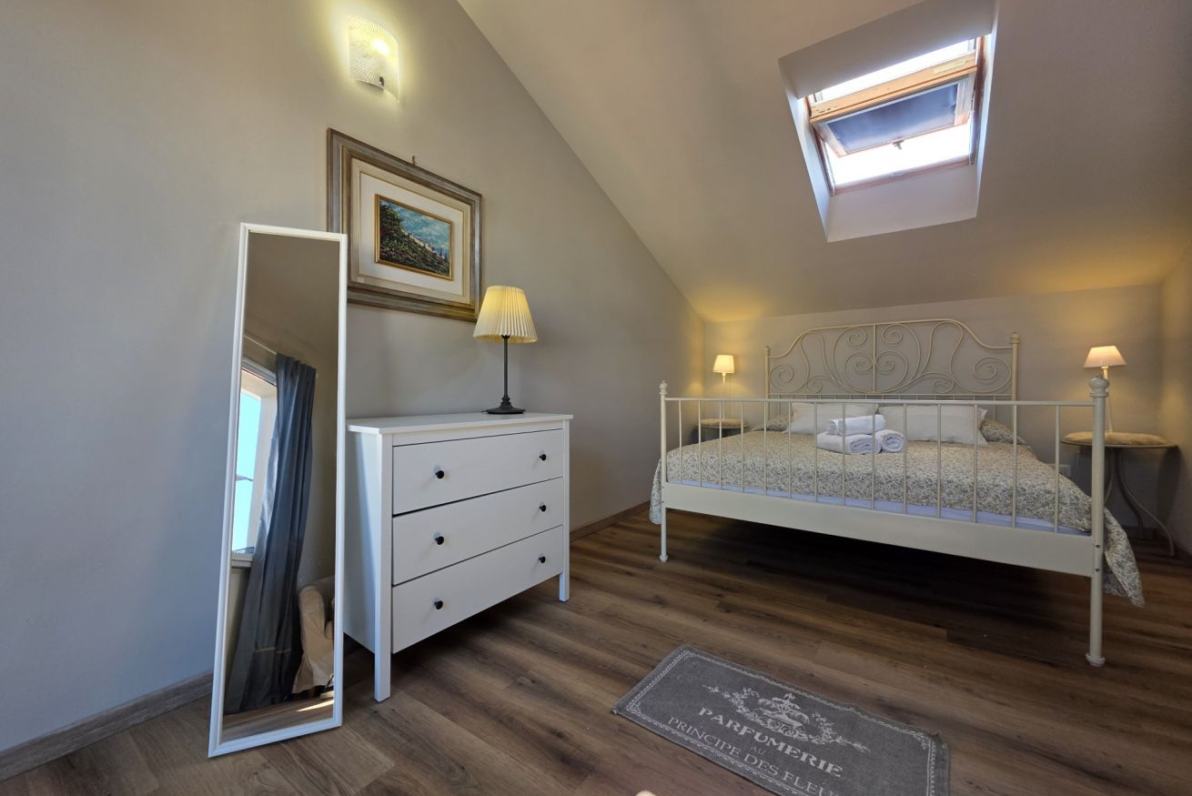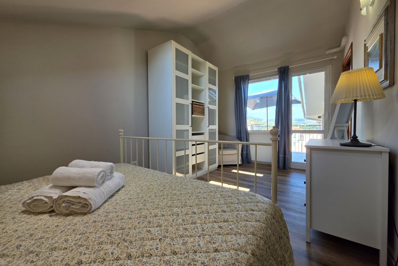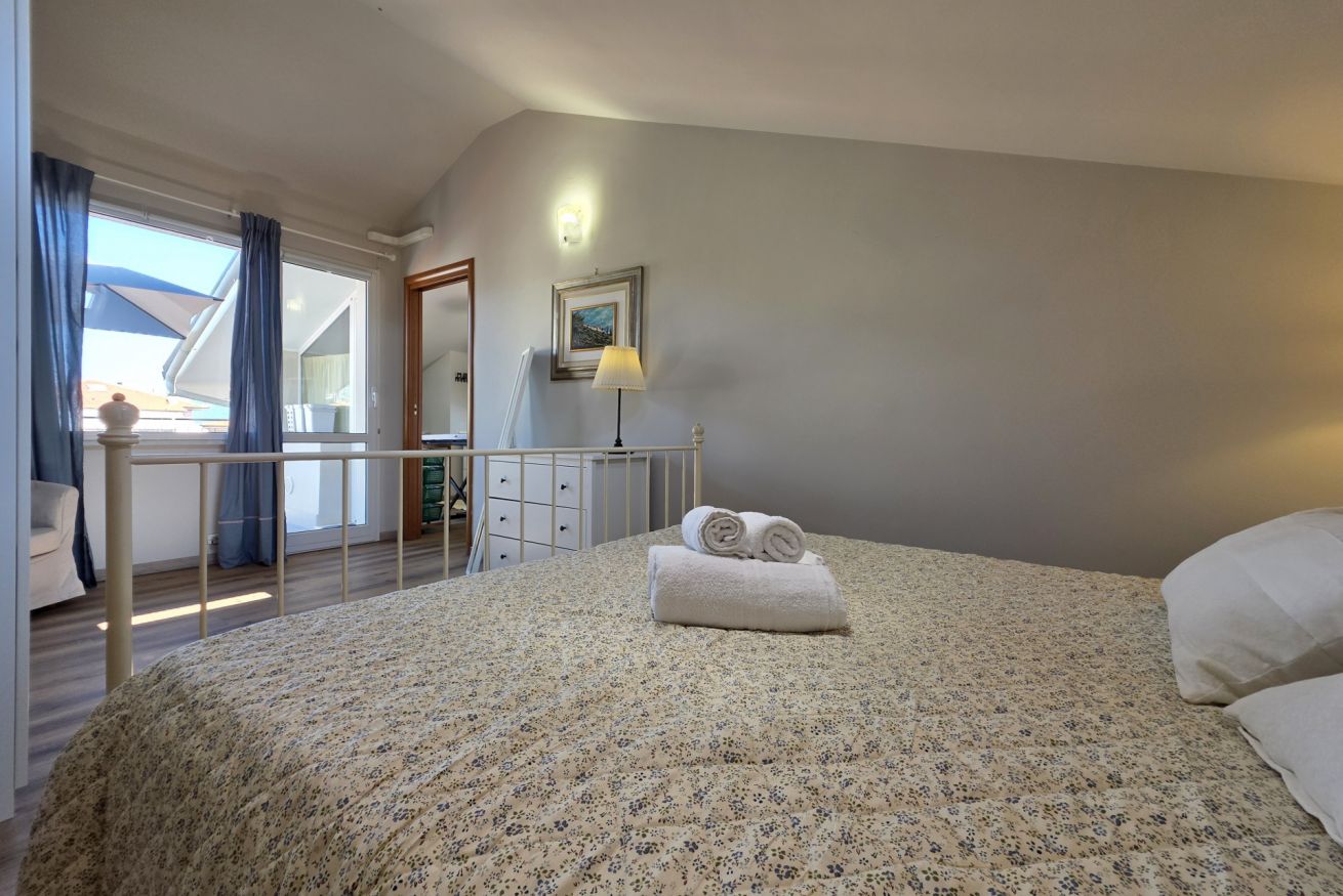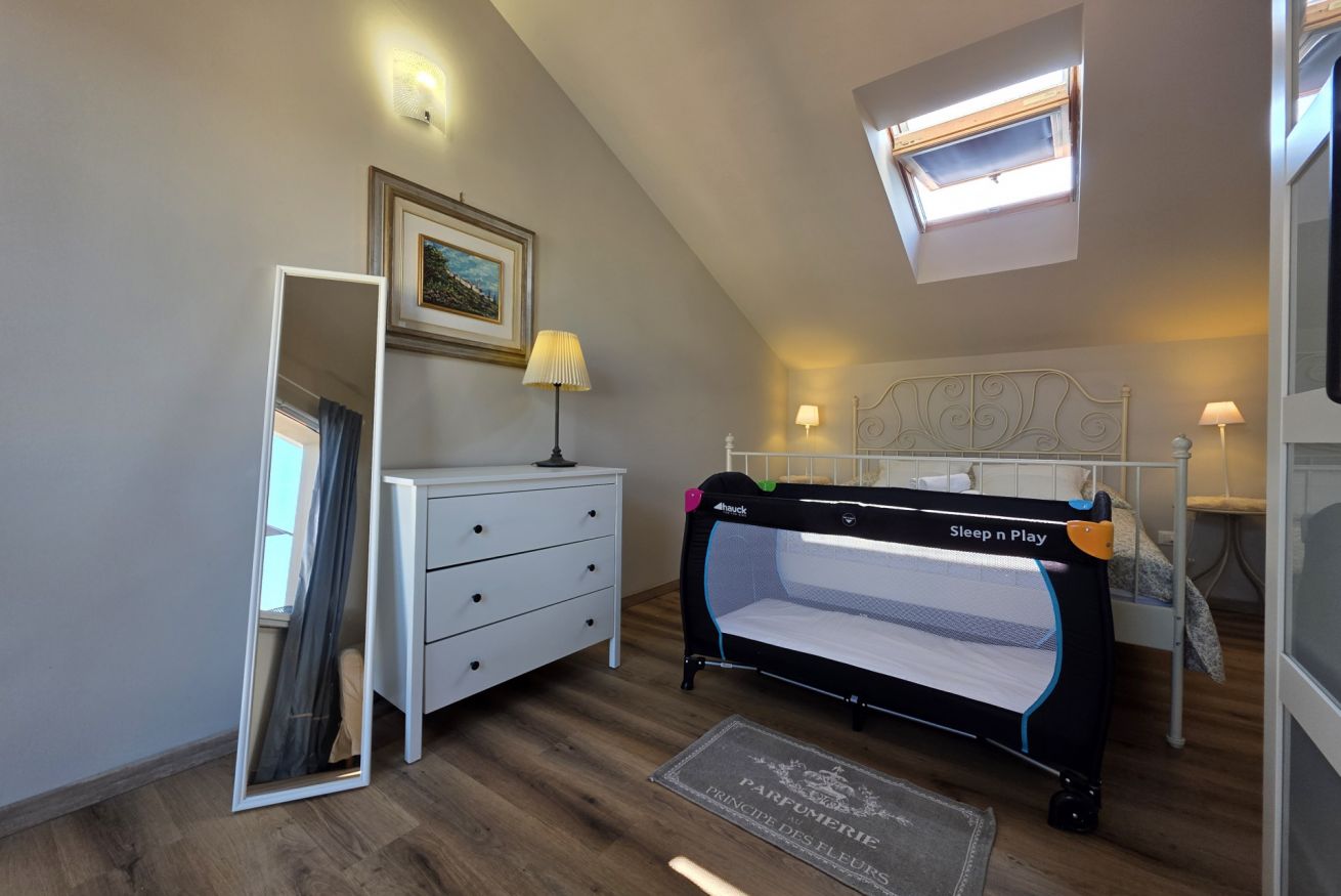 Letto matrimoniale, armadio, comodini con abat-jour, culla, climatizzatore e finestra sulla terrazza