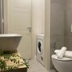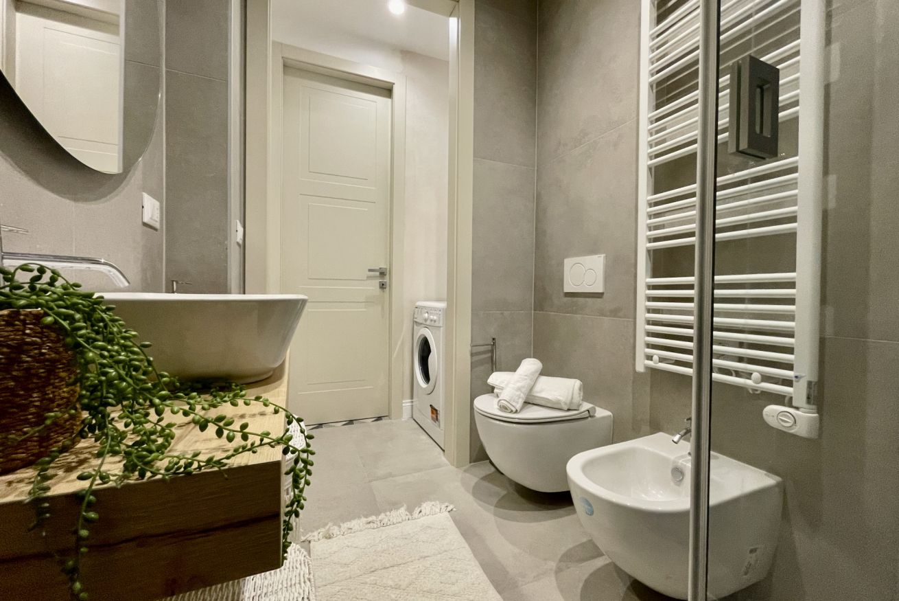Bagno completo con box doccia, sanitari, lavatrice, asciugacapelli e dotazione di bagno doccia.