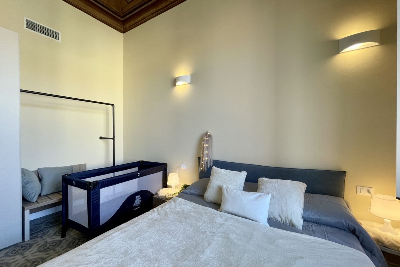 La camera matrimoniale è arredata con letto 160x190 cm, ampio armadio, pratico porta valigie in legno e lettino da campeggio (50x120 cm) adatto a un neonato.