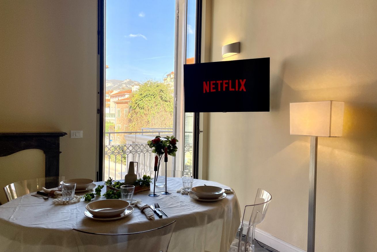 Zona living accogliente con tavolo da pranzo in legno e 4 sedie, Smart TV 43” con Netflix e comodo divano letto (140x160 cm). Dal soggiorno si accede al balcone, ideale per un momento di relax.