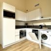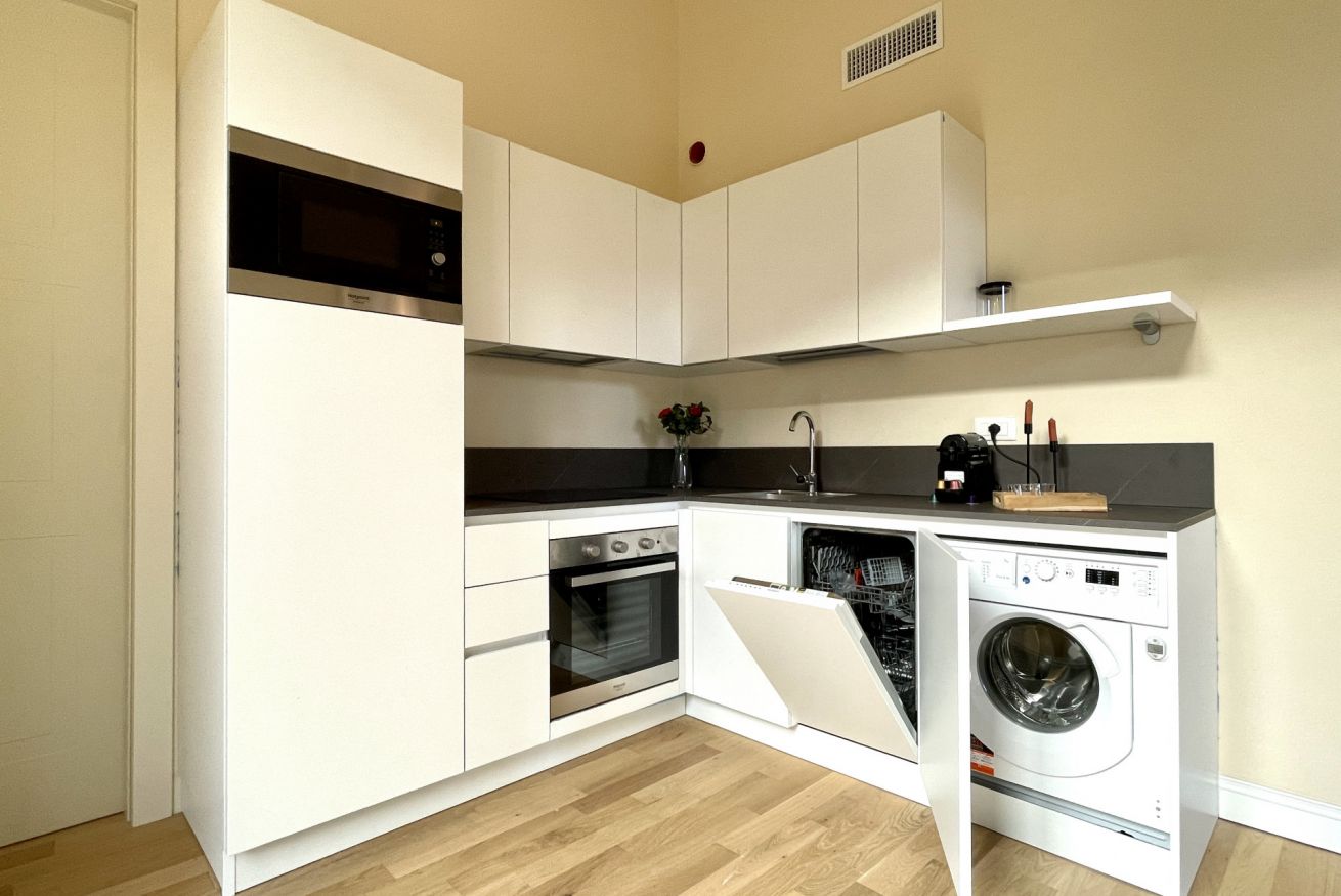 Completamente attrezzata con piano cottura a induzione (4 fuochi) e cappa, lavastoviglie, forno elettrico, microonde, frigorifero con congelatore, moka Bialetti, macchina caffè Nespresso, bollitore, lavatrice e set completo di pentole, stoviglie e utensili.