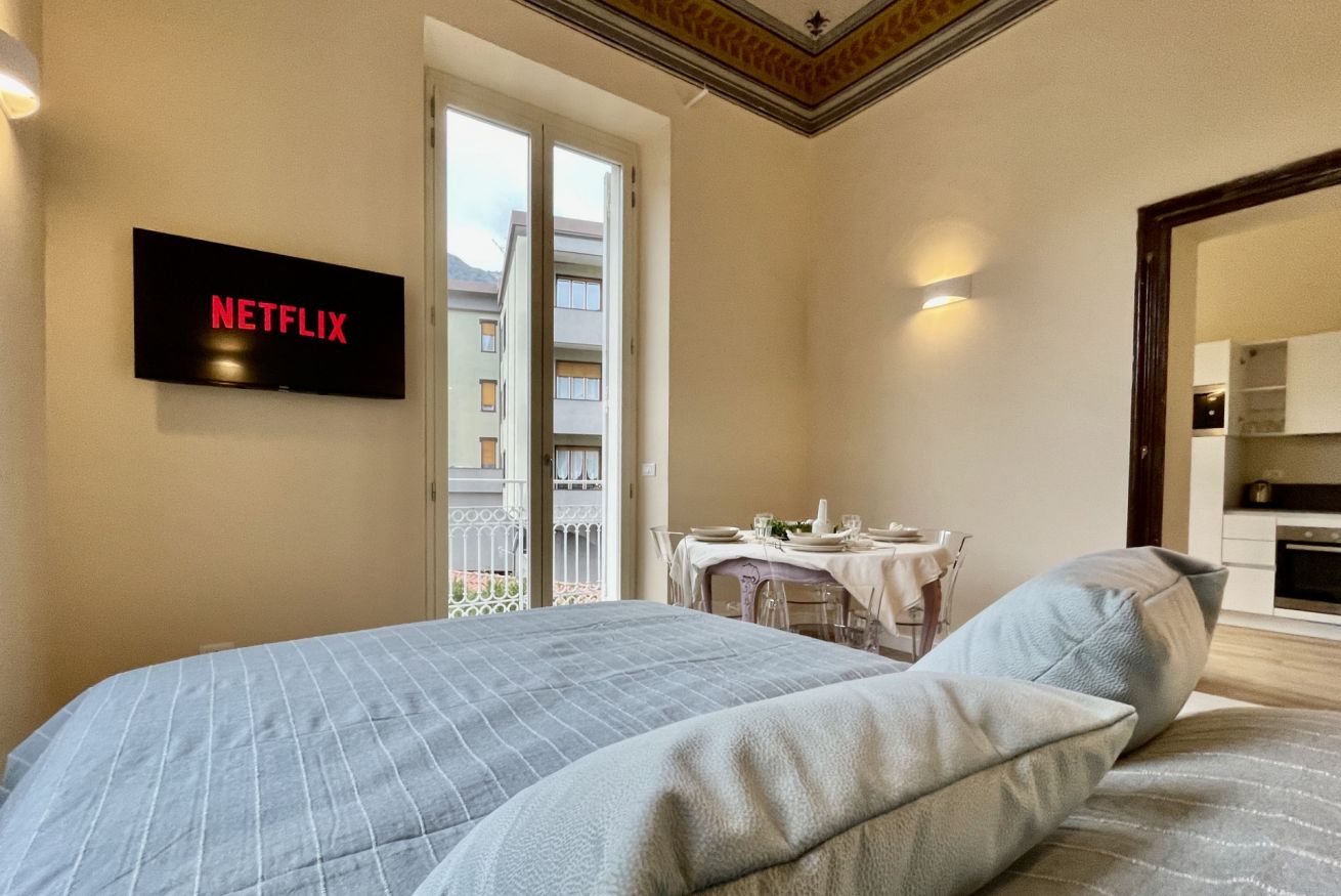 Ampia zona living con tavolo in legno e 6 sedie, Smart TV 43” con Netflix, comodo divano letto 1,40x1,90 m e accesso al balcone.